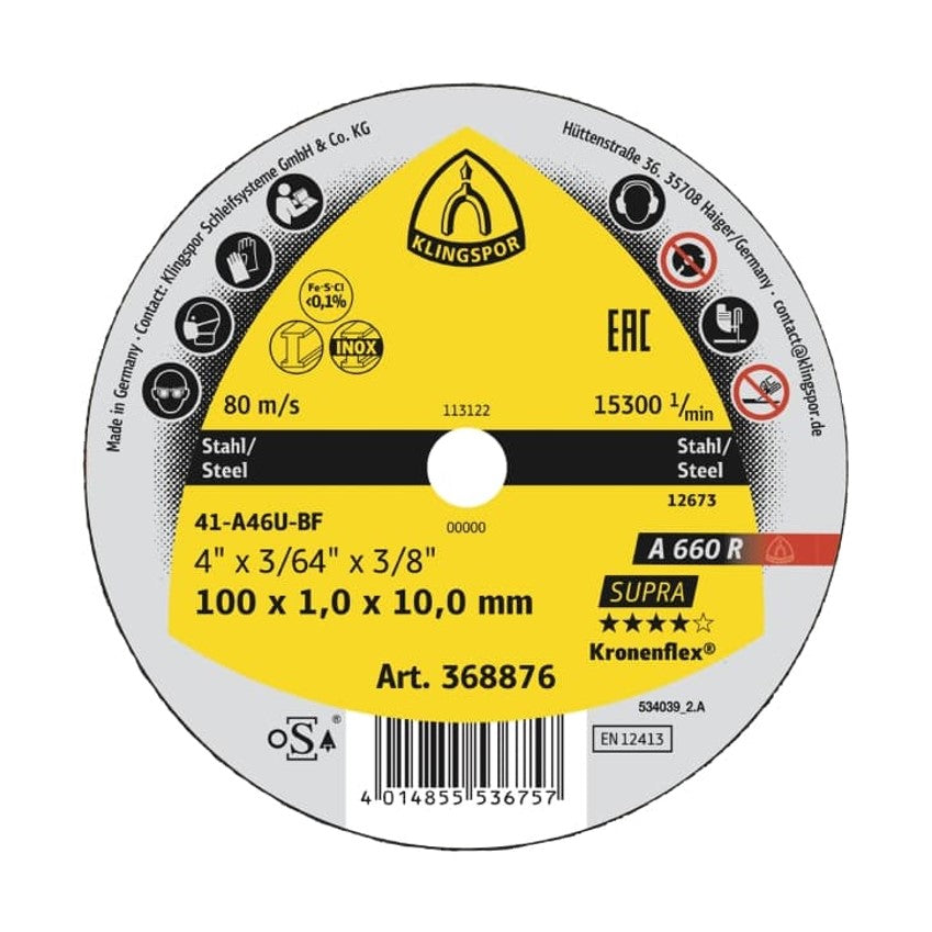 De Kronenflex® A 660 R Supra is een geavanceerde slijpschijf uit de Supra-klasse en is ontworpen voor het efficiënt doorslijpen van roestvast staal (RVS) en staal. Deze 1mm dunne slijpschijf combineert een agressieve snijwerking met een fijne snijlijn en minimale braamvorming, ideaal voor hoogwaardige snedes in platen, buizen en profielen.
