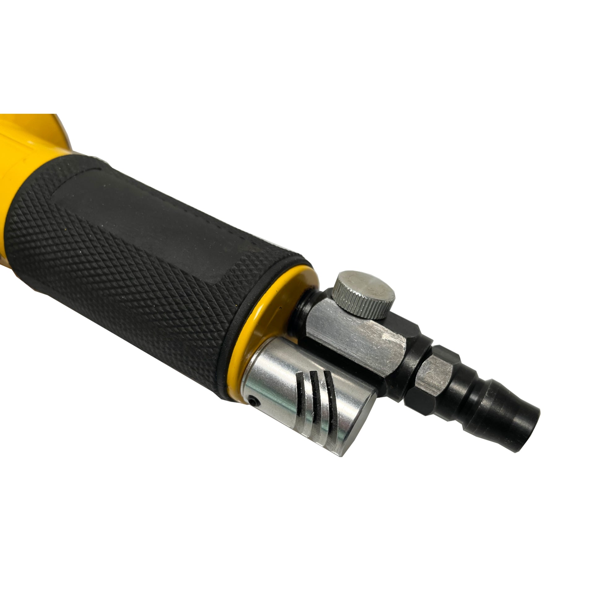 Het toerental kan traploos ingesteld worden door middel van de draaiknop op de machine. Deze draaiknop regelt de hoeveelheid lucht maximaal verbruikt door de machine. Daarnaast kan het toerental traploos geregeld worden met de kneep.